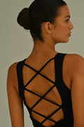 Este body elegante evoca la estética clásica de un maillot de ballet, reinterpretado con un aire sofisticado y femenino. Presenta un escote cuadrado que enmarca delicadamente el busto, aportando un toque de sencillez y refinamiento. La parte trasera se realza con cintas finas cruzadas, que dibujan un juego visual elegante sobre la espalda, recordando los lazos de las zapatillas de ballet. Su corte tipo corsé estiliza la silueta, con costuras estructuradas que definen la figura y aportan soporte, evocando la delicadeza del vestuario escénico con un giro moderno y sensual.